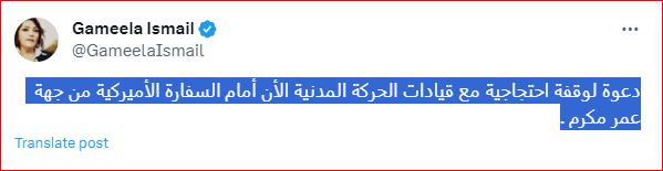 وكتبت إسماعيل خلال منشور لها على موقع التواصل الاجتماعي، “أكس”، تويتر سابقًا: دعوة لوقفة احتجاجية مع قيادات الحركة المدنية الآن أمام السفارة الأميركية من جهة عمر مكرم.