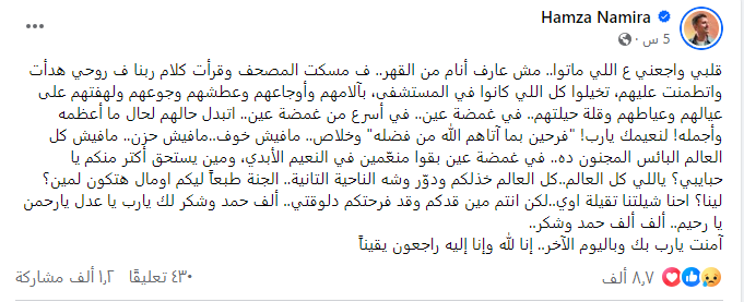 وكتب حمزة نمرة منشورًا، عبر حسابه الشخصي بموقع التواصل الاجتماعي فيس بوك، قال فيه: قلبي واجعني على اللي ماتوا، مش عارف أنام من القهر، فمسكت المصحف، وقرأت كلام ربنا، روحي هدأت واتطمنت عليهم.