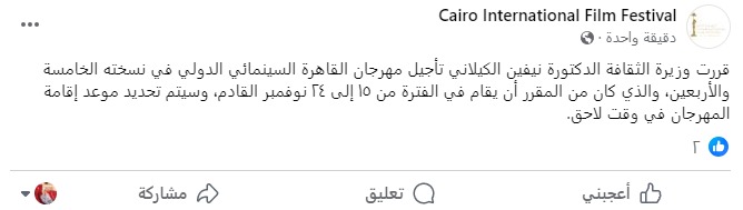 قررت وزيرة الثقافة الدكتورة نيفين الكيلاني، تأجيل مهرجان القاهرة السينمائي الدولي، في نسخته الـ 45، والذي كان من المقرر أن يقام خلال الفترة من 15 إلى 24 نوفمبر المقبل، وسيتم تحديد موعد إقامة المهرجان في وقت لاحق.