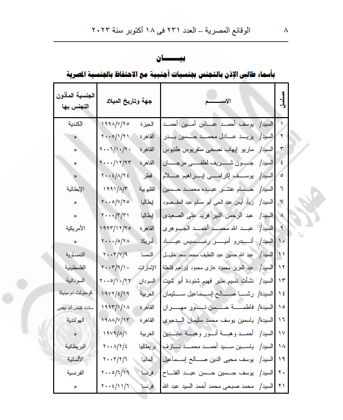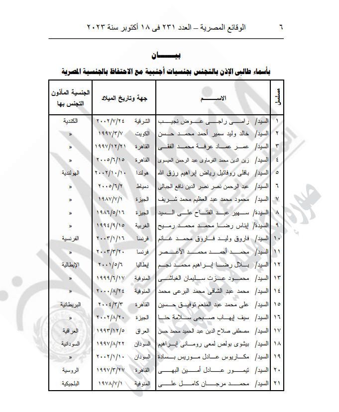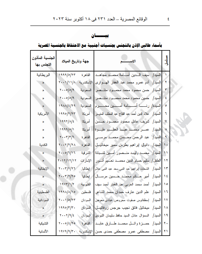 يُؤذن لكل من الواحد والعشرين مواطنا أولهم سيف الدين أسامة محمد مجاهد وآخرهم مصطفى عمرو مصطفى حمدي حسن المدرجة أسماؤهم بالبيان المرفق بالتجنس بالجنسية الأجنبية الموضحة قرين اسم كل منهم، مع احتفاظهم بالجنسية المصرية.