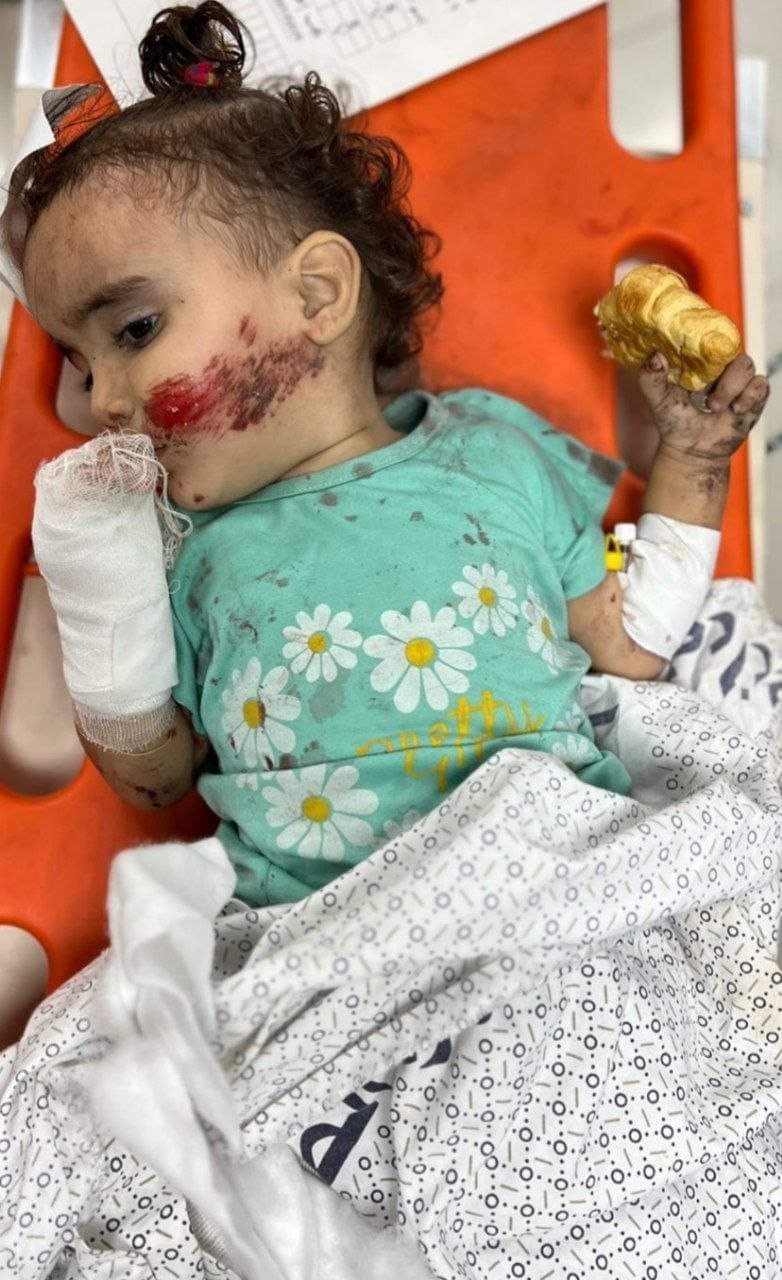 وتصدر عدد من الصور التي تتضمن مشاهد من قصف مستشفى المعمداني، منصات التواصل الاجتماعي، وأبرزها صورة لطفلة تبلغ من العمر بضعة أعوام، تنتشر الجروح في أماكن متفرقة من جسدها، وذراعها بها ضمادة، وتمسك في يدها الملطخة بالدماء قطعة من الخبز ومصروفها، تنظر من حولها للعالم المليء بالشهداء والجرحى والدماء، لتجد نفسها في مستشفى تتلقى العلاج تحت القصف.