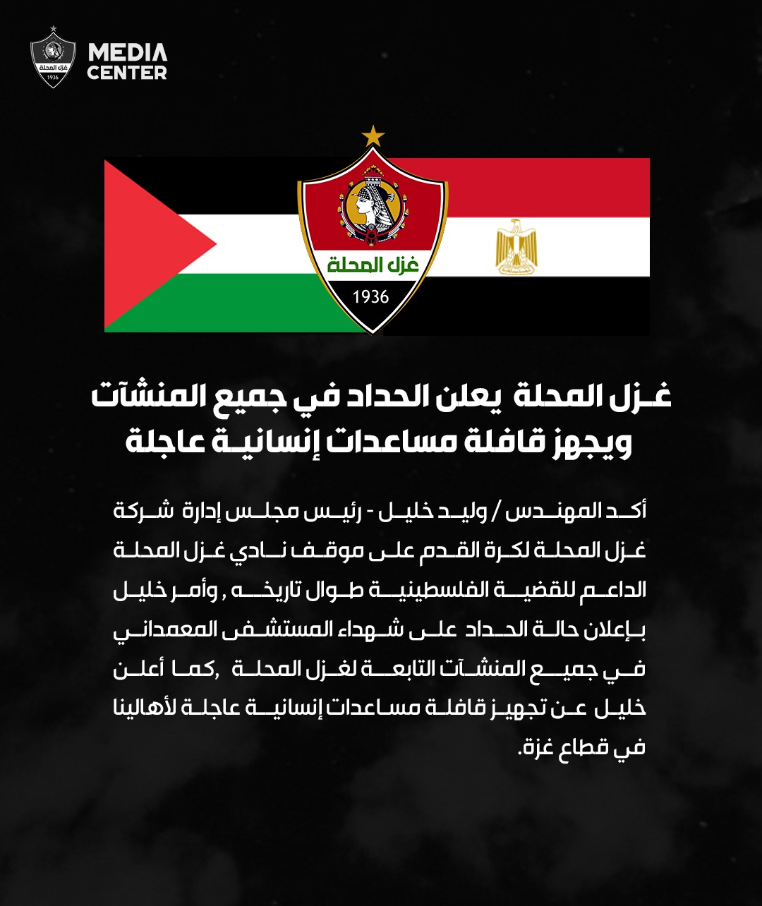 أكد المهندس وليد خليل رئيس مجلس إدارة شركة غزل المحلة لكرة القدم، على موقف نادي غزل المحلة الداعم للقضية الفلسطينية طوال تاريخه.