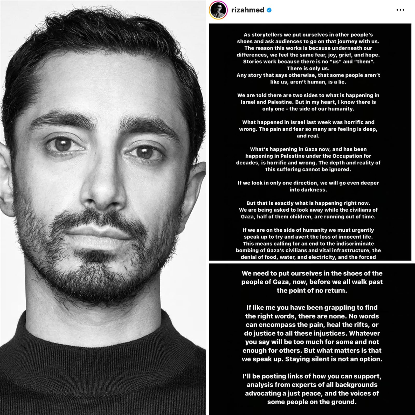 وحرص الممثل المسلم ريز أحمد على دعم القضية الفلسطينية قائلًا: ما يحدث في غزة الآن، وما يحدث في فلسطين تحت الاحتلال منذ عقود، أمر مروع وخاطئ، لا يمكن تجاهل عمق وواقع هذه المعاناة.
