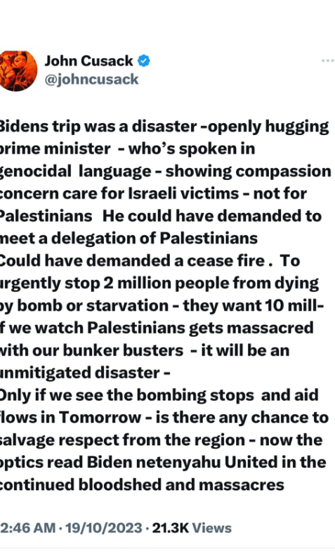 كما انتقد جون زيارة الرئيس الأمريكي لإسرائيل قائلًا: كانت رحلة بايدن كارثية، معانقة علنية لرئيس الوزراء الإسرائيلي الذي تحدّث بلغة الإبادة الجماعية، كان بإمكانه وقف موت مليوني شخص بشكل عاجل بالقنابل أو المجاعة التي أصابت شعب غزة.