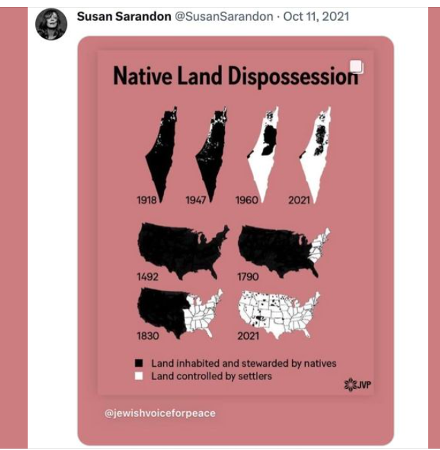 وحرصت النجمة سوزان ساراندون على دعم فلطسين والقضية الفلسطينية، حيث نددت بهجمات الاحتلال الإسرائيلي ضد المدنيين بغزة، وكانت دائمًا مدافعة عن القضية الفلسطينية، ففي عام 2021 نشرت صورة، فيها مقارنة بين ما حصل للفلسطينيين في بلدهم فلسطين، وما حصل للسكان الأصليين في الولايات المتحدة، الذين يطلق عليهم اليوم وصف الهنود الحمر، وكأنها تقول إن الحكومة الأمريكية والاحتلال الإسرائيلي وجهان لعملة واحدة.