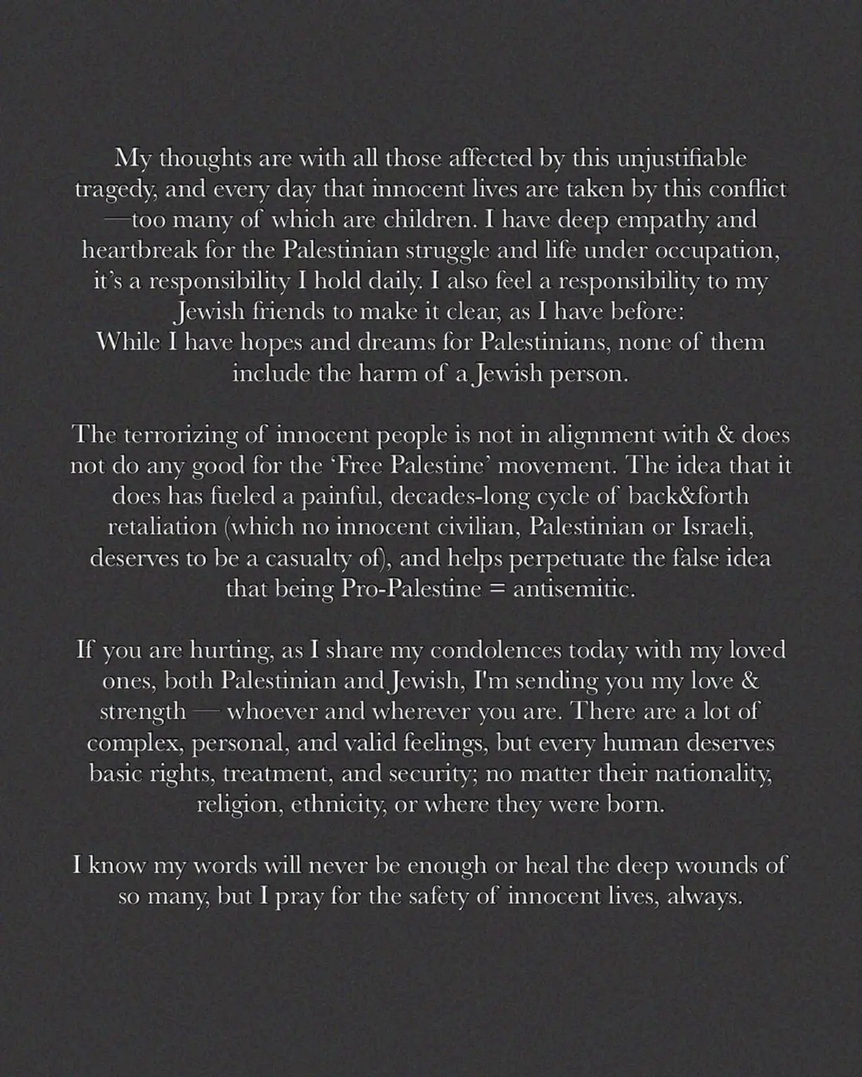 كما دعمت النجمة جيجي حديد القضية الفلسطينية قائلة: إن أفكاري مع جميع المتضررين من هذه المأساة غير المبررة وفي كل يوم يحصد فيه هذا الصراع أرواحًا بريئة، والعديد منهم من الأطفال، أشعر بتعاطف عميق وحسرة مع النضال الفلسطيني والحياة تحت الاحتلال، إنها مسؤولية أحملها يوميًا.