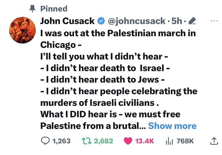 حرص النجم الأمريكي جون كوزاك على توجيه الدعم الكامل للشعب الفلسطيني ضد إسرائيل، كما لم يكتف بنشر البوستات فقط، بل شارك في عدة مظاهرات تندد بجرائم الاحتلال.