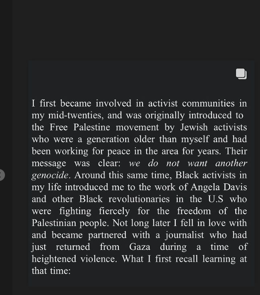 وتابع: ما سمعته بالفعل هو يجب علينا تحرير فلسطين من الاحتلال الوحشي، وسمعت أشخاصًا يشاركون روايات شخصية عن أفراد من عائلاتهم سُجنوا، وتعرضوا للإهانة، والمضايقة، والاضطهاد، والاستهداف، والقتل على مدى أجيال.