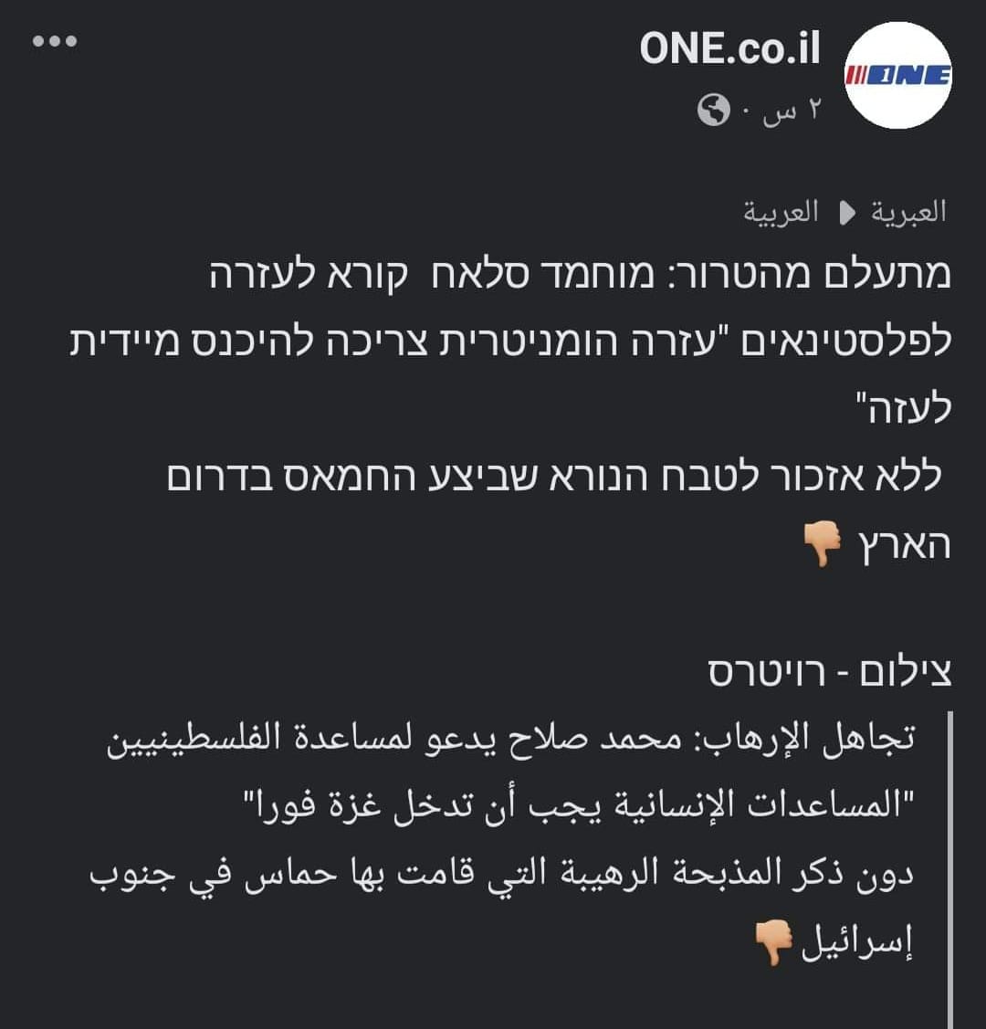 بينما قالت صحيفة one.co.il الإسرائيلية، إن محمد صلاح يدعو لمساعدة الفلسطينيين دون ذكر ما فعلته حماس في جنوب إسرائيل الأسبوع الماضي.