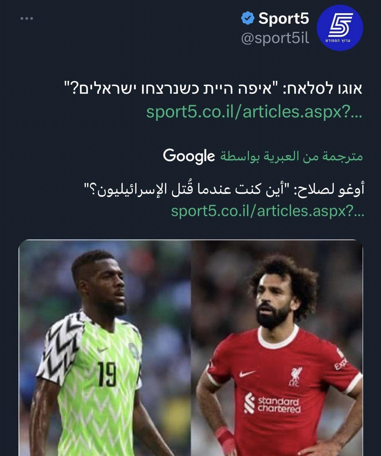 كما نشرت الشبكة تصريحات الاعب الدولي النيجيري أوغو وهو يوجه رسالة لمحمد صلاح، يقول فيها: أين كنت عندما توفى الإسرائيليين؟