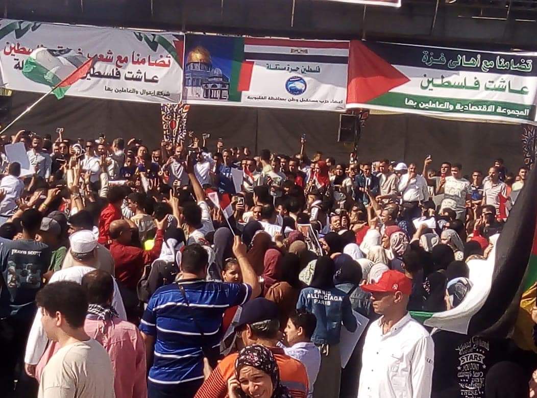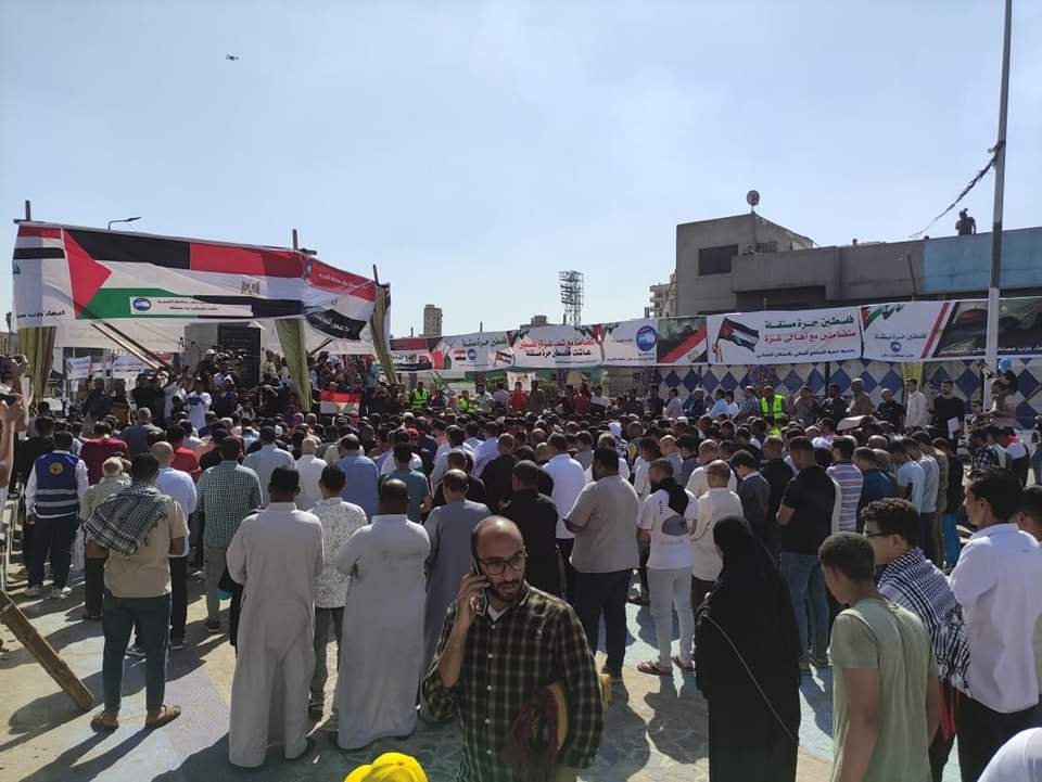احتشد ميدان المؤسسة بمدينة شبرا الخيمة بمحافظة القليوبية، بالآلاف من الأهالي الذين جاءوا من جميع القري والمراكز بنطاق المحافظة للمشاركة في تظاهرة كبيرة دعما للقضية الفلسطينية.