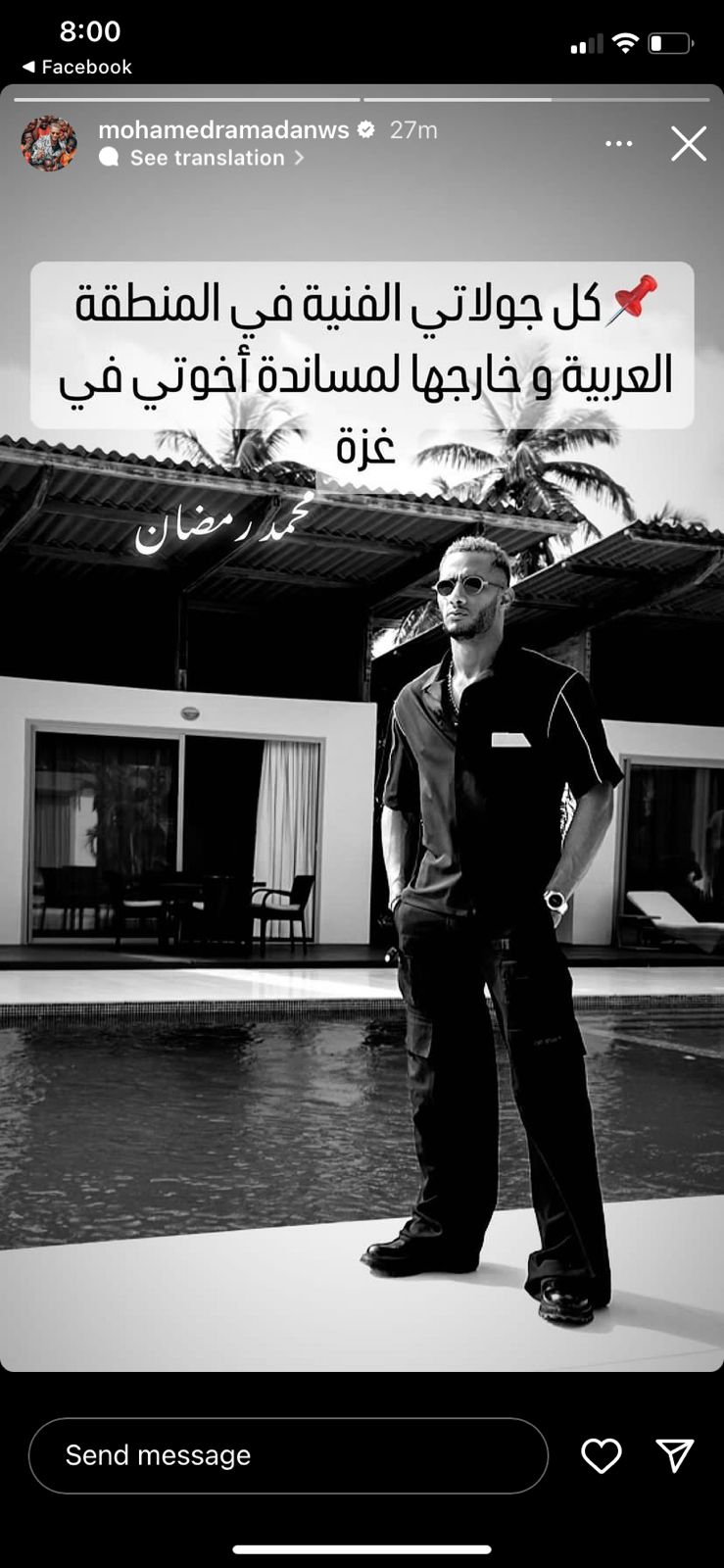 ونشر محمد رمضان على حسابه الرسمي بـ انستجرام عبر خاصيه استوري، صورة له معلقًا: كل جولاتي الفنية في المنطقة العربية وخارجها لمساندة أخواتي في غزة.