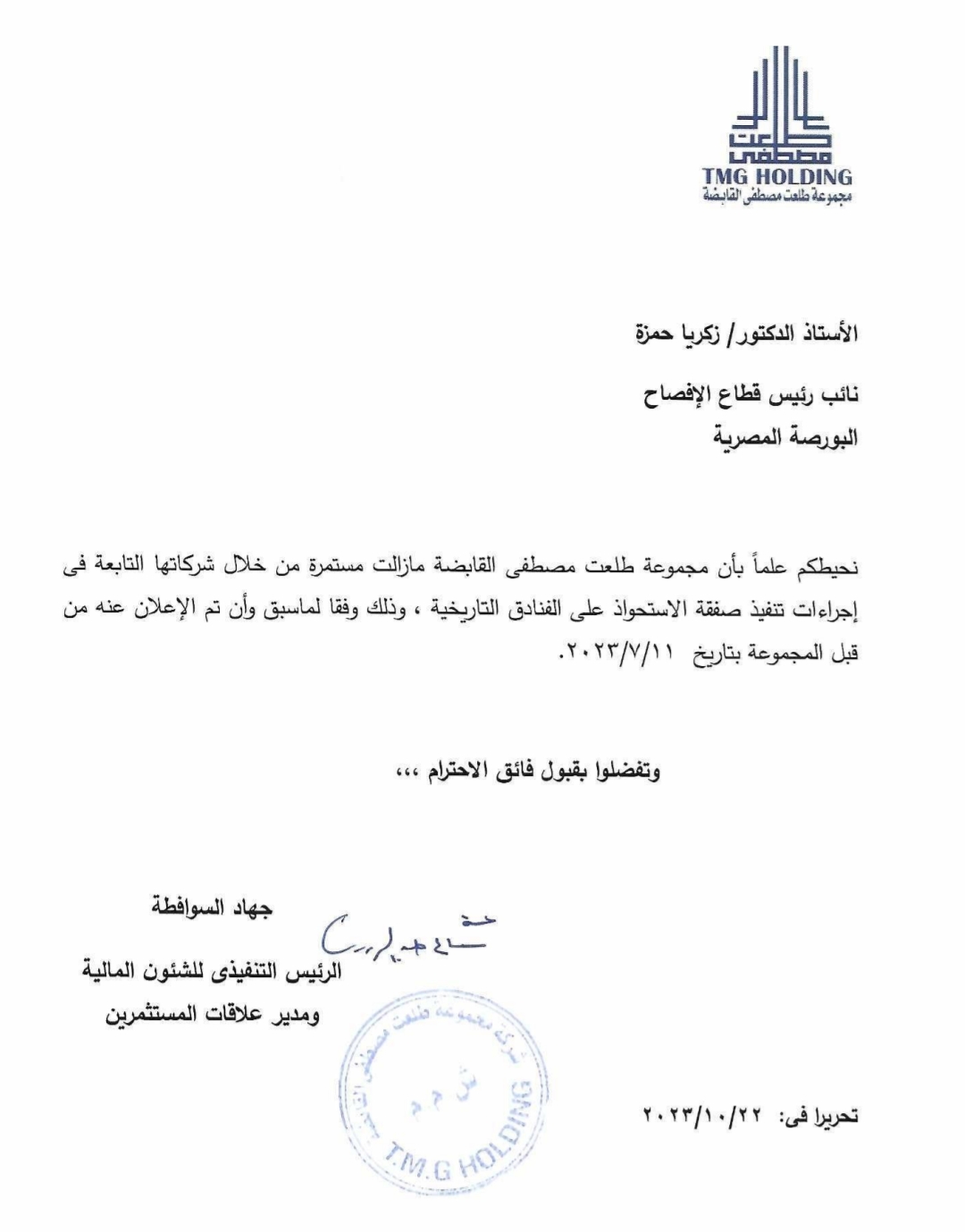 قالت مجموعة طلعت مصطفى القابضة، إنها مازالت مستمرة من خلال شركاتها التابعة في إجراءات تنفيذ صفقة الاستحواذ على شركة الفنادق التاريخية.