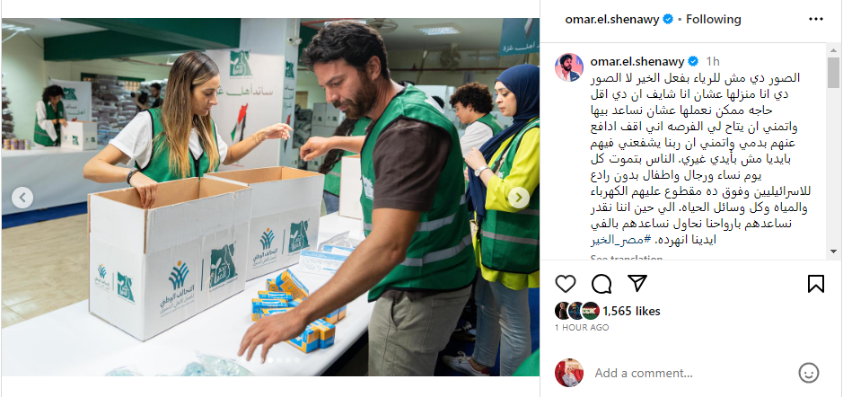 شارك الفنان عمر الشناوي متابعيه عدة صور له رفقة الفنانة أمينة خليل، والفنانة أسماء جلال، والفنان باسل الزارو، خلال مشاركتهم في تحضير المساعدات الغذائية والعلاجية لأهالي غزة، بعد حالة الدمار الشامل في القطاع.