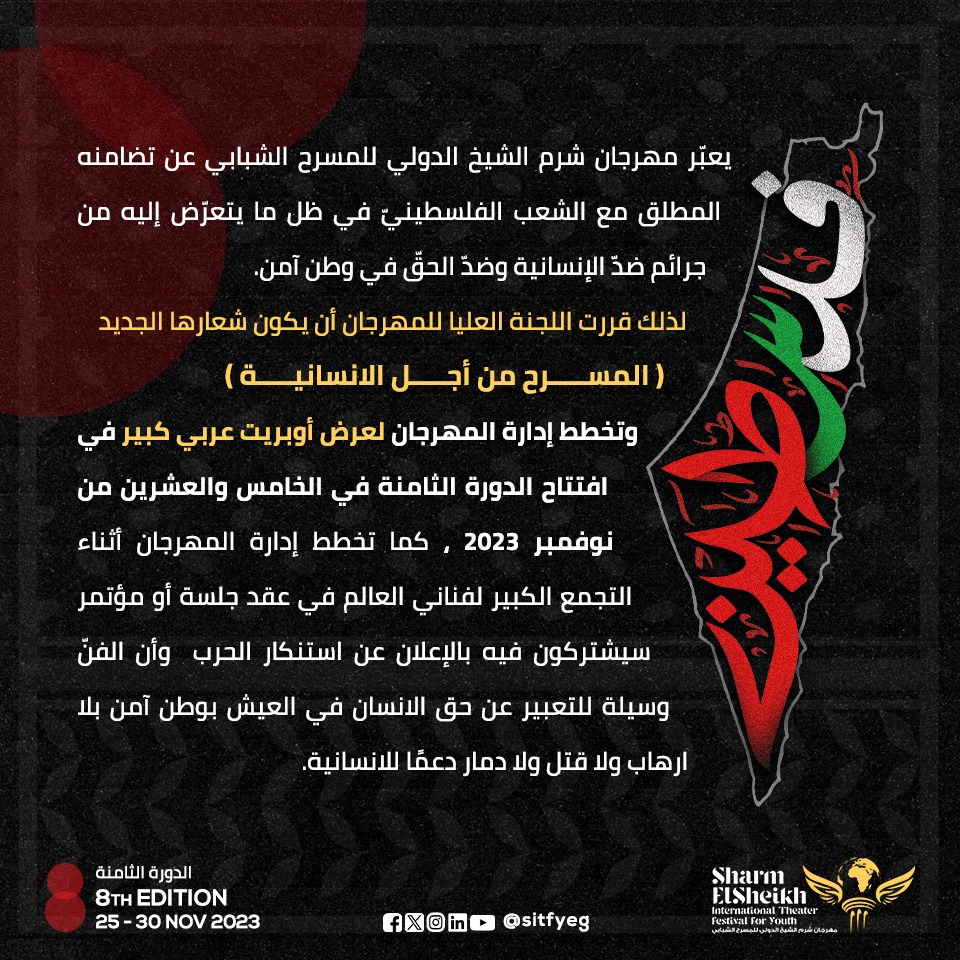 عبر مهرجان شرم الشيخ الدولي للمسرح الشبابي عن تضامنه المطلق مع الشعب الفلسطينيّ، في ظل ما يتعرّض إليه من جرائم ضدّ الإنسانية وضدّ الحقّ في وطن آمن.