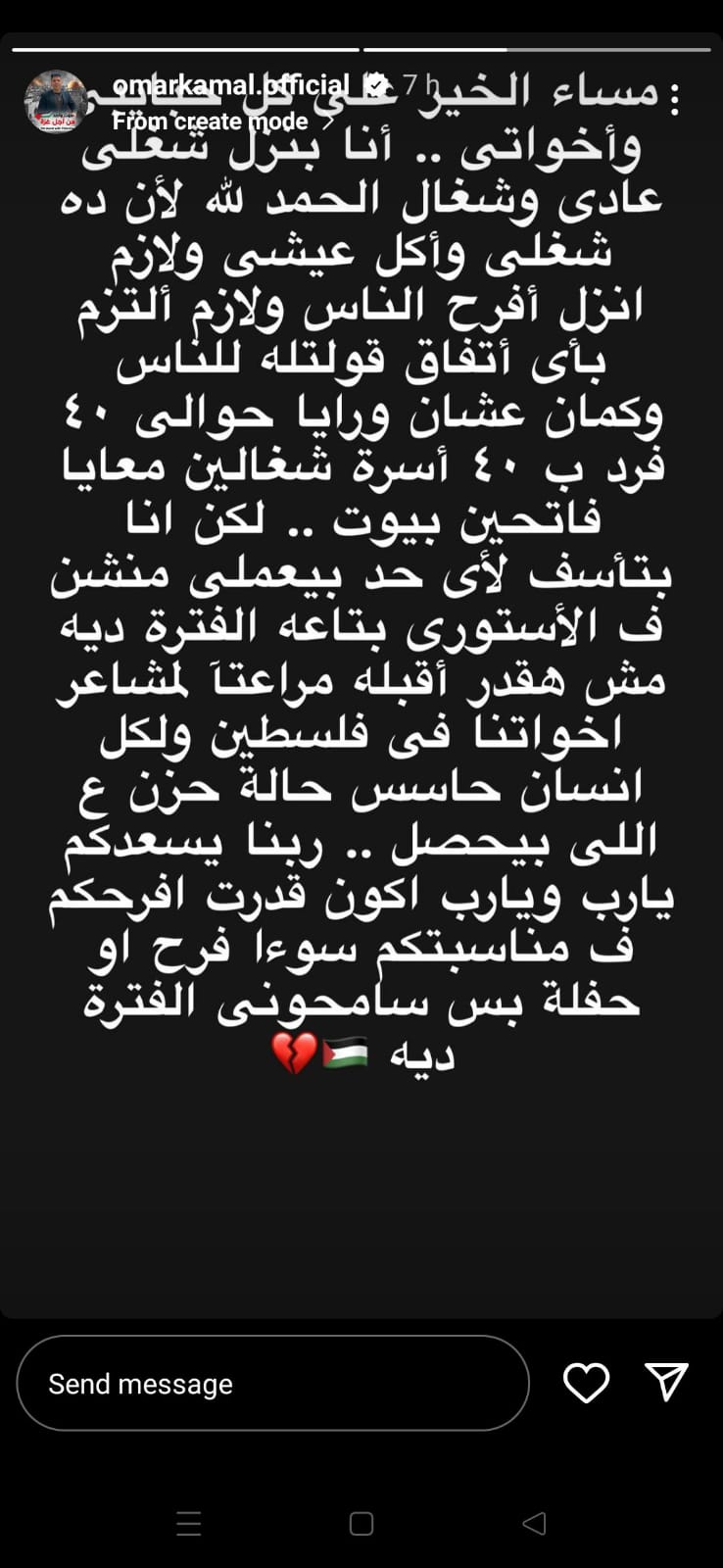 وتابع عمر كمال: لكن أنا بتأسف لأي حد بيعملي منشن في الاستوري بتاعته الفترة دي مش هقدر أقبله مراعاة لمشاعر إخواتنا في فلسطين ولكل إنسان حاسس حالة حزن على اللي بيحصل، ربنا يسعدكم يا رب ويا رب أكون قدرت أسعدكم في مناسباتكم سواء فرح أو حفلة بس سامحوني الفترة دي.