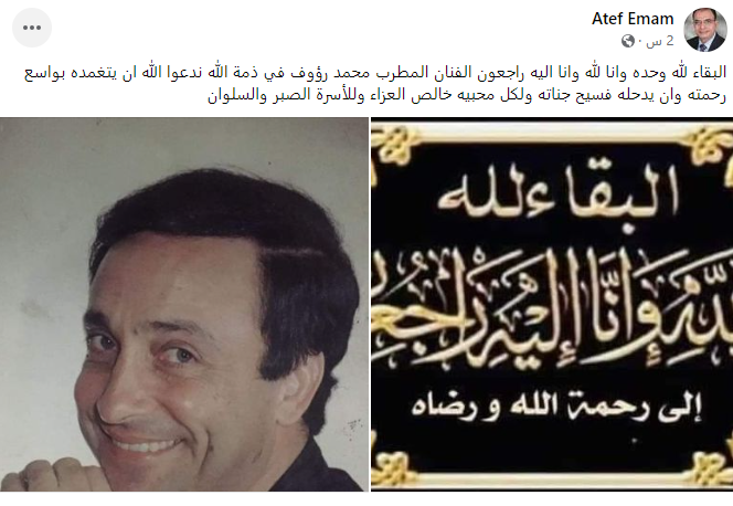 وكتب عاطف إمام منشورًا عبر حسابه الشخصي بموقع التواصل الاجتماعي فيس بوك، قال فيه: البقاء لله وحده وانا لله وانا اليه راجعون الفنان المطرب محمد رؤوف في ذمة الله ندعوا الله ان يتغمده بواسع رحمته وأن يدخله فسيح جناته ولكل محبيه خالص العزاء وللأسرة الصبر والسلوان.