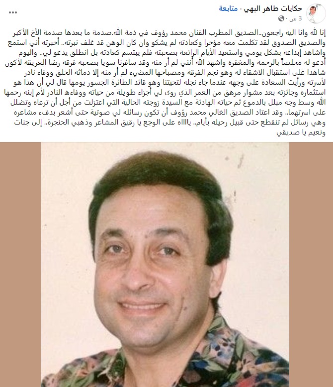 وكتبت طاهر الباهي منشورًا عبر حسابه الشخصي بموقع فيسوك جاء فيه: إنا لله وانا اليه راجعون، الصديق المطرب الفنان محمد رؤوف في ذمة الله، صدمة ما بعدها صدمة الأخ الأكبر والصديق الصدوق لقد تكلمت معه مؤخرًا وكعادته لم يشكُ وإن كان الوهن قد غلف نبرته.