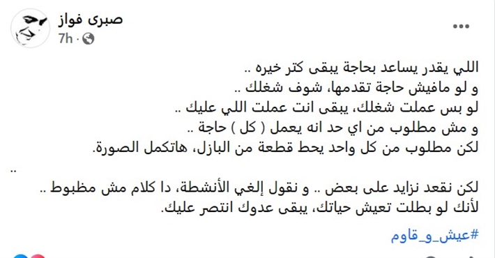 وكتب صبري فواز عبر حسابه الشخصي بموقع التواصل الاجتماعي فيسبوك: اللي يقدر يساعد بحاجة يبقى كتر خير.. ولو مافيش حاجة تقدمها شوف شغلك.. لو بس عملت شغلك يبقى أنت عملت اللي عليك.. ومش مطلوب من أي حد أنه يعمل كل حاجة.. لكن مطلوب من كل واحد يحط قطعة من البازل هتكمل الصورة.