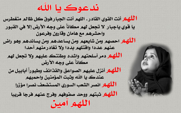 - يارب، يا من قلت وقولك الحق:"ادعوني أستجب لكم"، نرجوك أن تمن بالنصر على أهل فلسطين وترحمهم مما هم فيه.