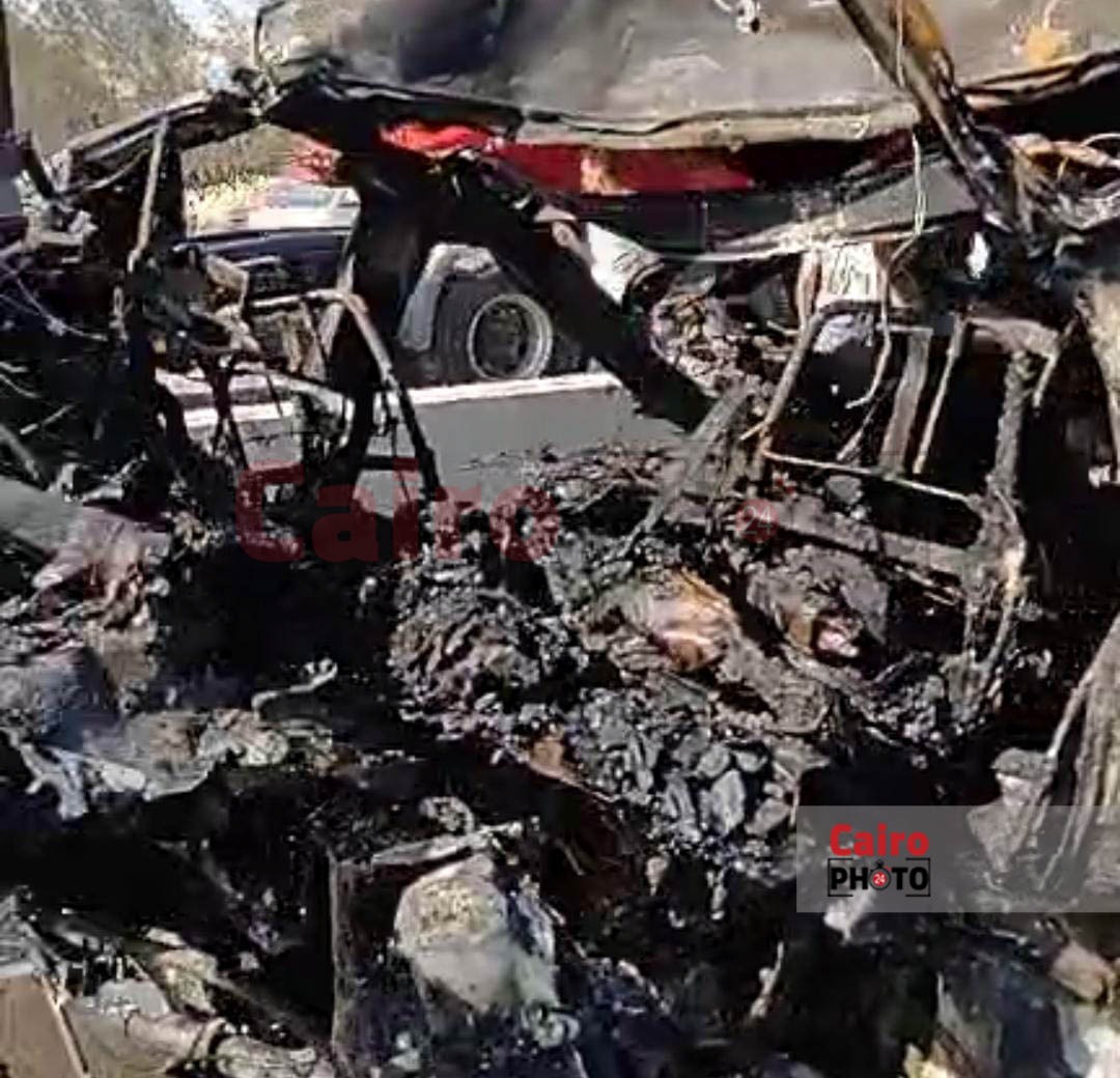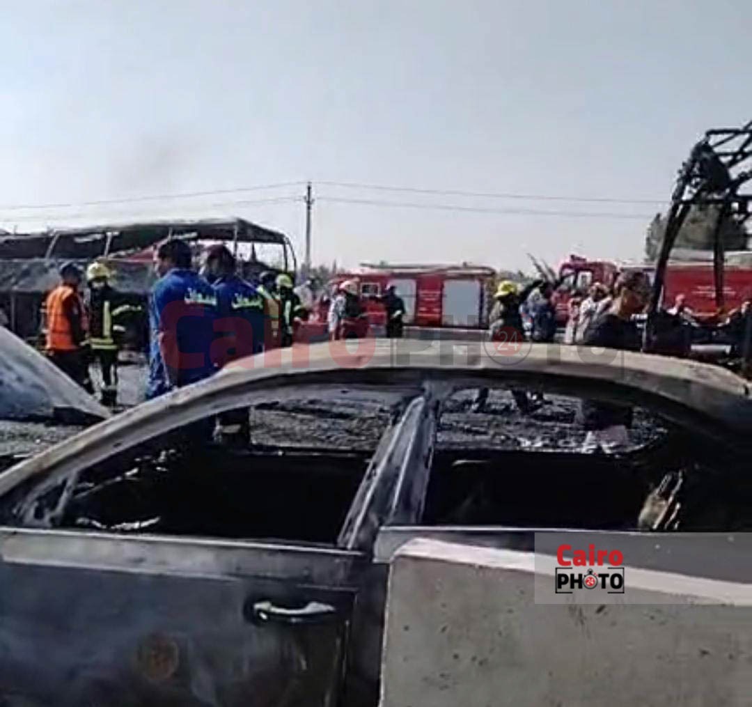 والتهمت النيران 6 سيارات من بينهم أتوبيس و3 سيارات ملاكي وسيارة نقل ثقيل، ويقوم رجال المرور بسحب الكثافات المرورية على طريق إسكندرية الصحراوي لتسيير حركة المركبات.