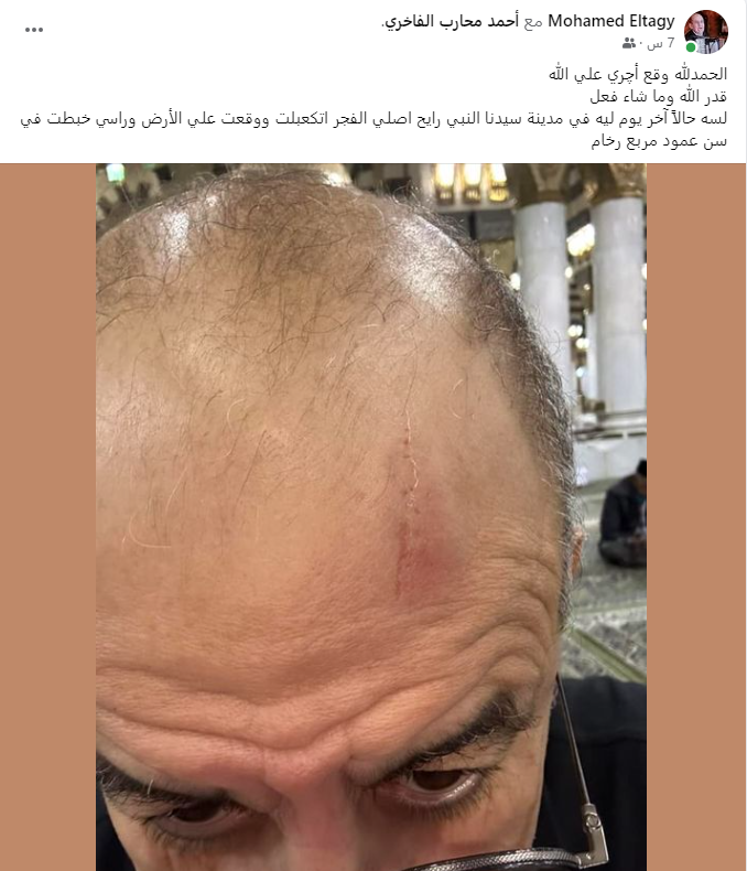 ونشر محمد التاجي صورة له، عبر حسابه الشخصي بموقع التواصل الاجتماعي فيس بوك، قال فيه: الحمد لله وقع أجري على الله، قدر الله وما شاء فعل، لسه حالًا آخر يوم ليا في مدينة سيدنا النبي، رايح أصلي الفجر، تكعبلت ووقعت على الأرض، وراسي خبطت في سن عمود مربع رخام.