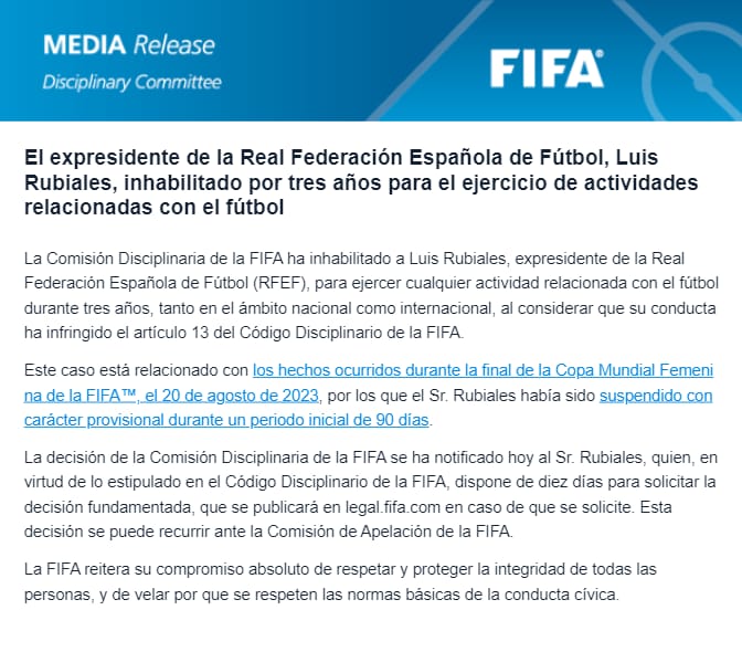 وقال الاتحاد الدولي لكرة القدم فيفا في بيانه الرسمي اليوم الإثنين، إن لويس روبياليس رئيس الاتحاد الإسباني السابق تم إيقافه عن ممارسة الأنشطة المتعلقة بكرة القدم لمدة 3 سنوات بعد تقبيله للمهاجمة الإسبانية جيني هيرموسو في نهائي كأس العالم للسيدات وسلوكه تجاه باقي اللاعبين.