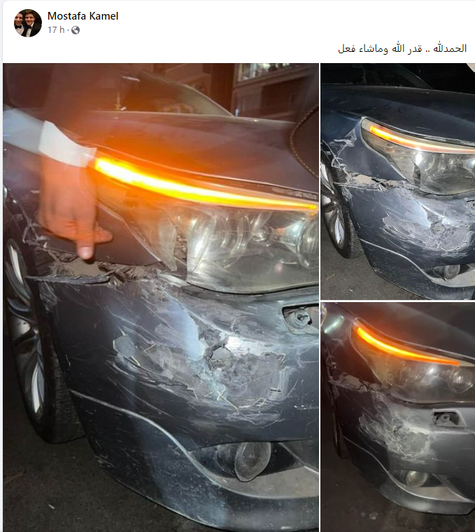 ونشر مصطفى كامل، مجموعة صور لتحطم سيارته، عبر حسابه الشخصي بموقع التواصل الاجتماعي فيسبوك، وعلق قائلًا: الحمد لله.. قدر الله وما شاء فعل.
