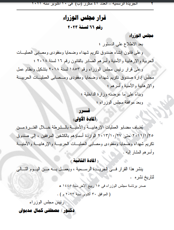 ونص القرار على أنه يضاف بعض مصابي العمليات الإرهابية والأمنية بالشرطة إلى صندوق تكريم شهداء وضحايا ومفقودي ومصابى العمليات الحربية والإرهابية والأمنية وأسرهم، على أن ينشر هذا القرار في الجريدة الرسمية، ويعمل بــه مـن اليـوم التالي لتاريخ نشره.