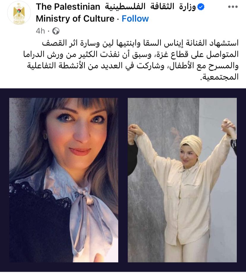 وكتبت الصفحة الرسمية لوزارة الثقافة الفلسطينية، عبر حسابها الشخصي بموقع التواصل الاجتماعي فيسبوك، وقالت: استشهاد الفنانة إيناس السقا وابنتيها لين وسارة أثر القصف المتواصل على قطاع غزة، وسبق أن نفذت الكثير من ورش الدراما والمسرح مع الأطفال، وشاركت في العديد من الأنشطة التفاعلية المجتمعية.