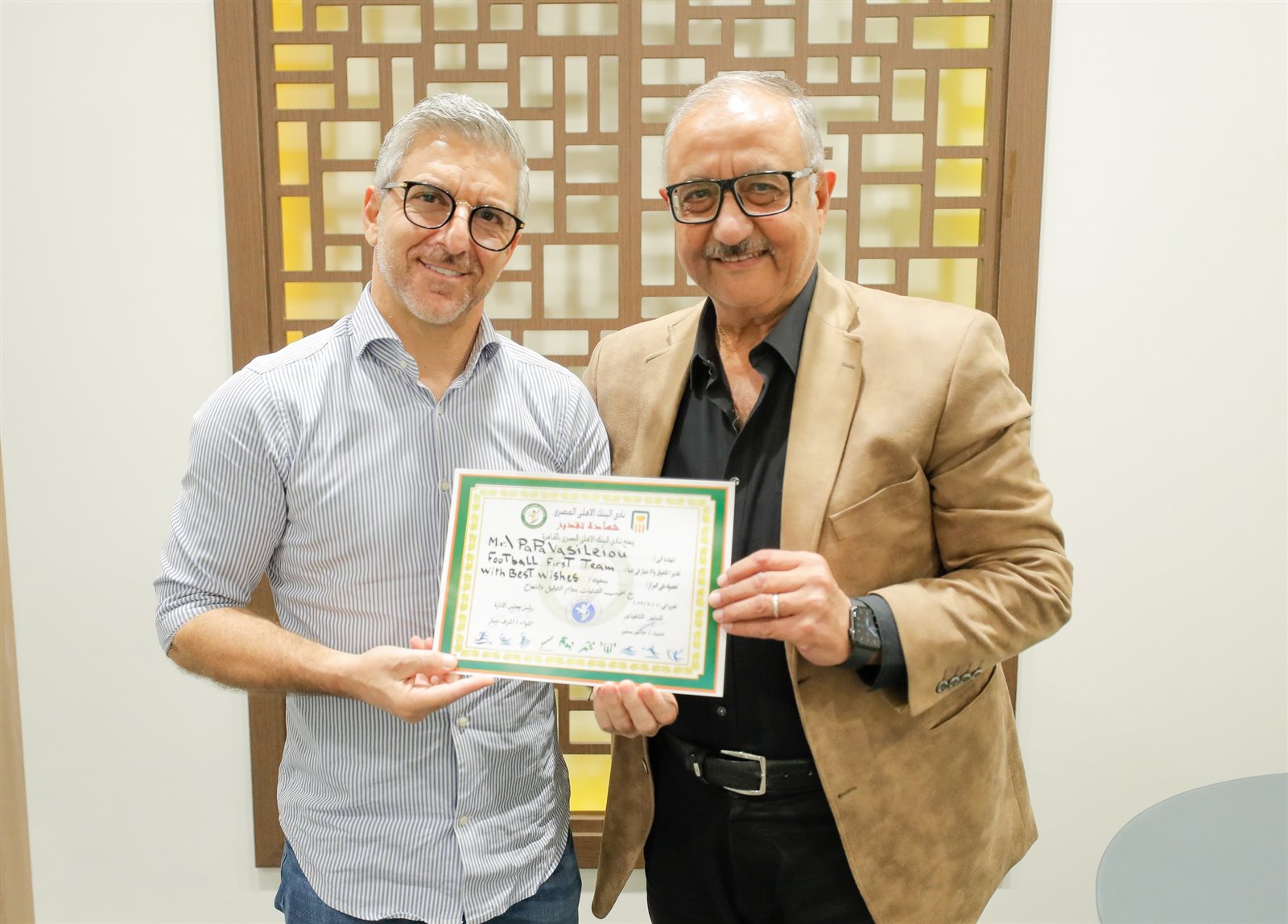 حرص اللواء أشرف نصار رئيس مجلس إدارة نادي البنك الأهلي، على تكريم بابافاسيليو المدير الفني السابق لفريق الكرة الأول، وجهازه المعاون؛ نظرًا للعطاء الكبير والجهد المبذول الذي بُذل خلال الفترة الماضية، متمنيًا لهم التوفيق والنجاح في خطواتهم المقبلة.