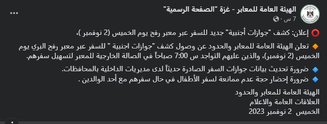 الهيئة الفلسطينية المسؤولة عن إدارة المعبر من جانب قطاع غزة، أوضحت أنه تم الإعلان عن عدد من جوازات السفر الأجنبية بلغ 400 مسافر، للخروج عبر معبر رفح اليوم الخميس، وطالبتهم بالتواجد في الصالة الخارجية للمعبر لتسهيل سفرهم، إلى جانب ضرورة تحديث بيانات أوراق السفر الصادرة حديثًا لدى مديريات الداخلية بالمحافظات.