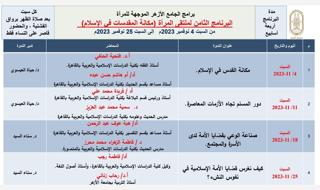 وقال الدكتور عبد المنعم فؤاد، إن البرامج الموجهة للمرأة والأسرة بالجامع الأزهر، تناقش القضايا التي تهم المرأة وتواجه جميع مشكلاتها، مؤكدا أن ندوة السبت المقبل، هي أولى ندوات الموسم الثامن ضمن البرامج الموجهة للمرأة والأسرة.