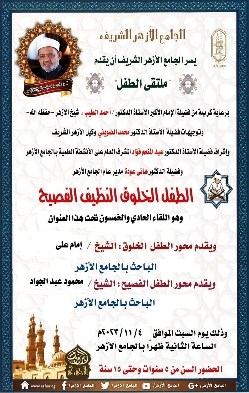 يواصل الجامع الأزهر الشريف اليوم السبت الموافق 12 نوفمبر 2023، عقد حلقة جديدة من ملتقى الطفل، والذي يأتي تحت عنوان: " الطفل الخلوق - النظيف - الفصيح"، وذلك تحت رعاية فضيلة الإمام الأكبر الأستاذ الدكتور أحمد الطيب شيخ الأزهر الشريف، وبمتابعة الدكتور محمد الضويني وكيل الأزهر الشريف، وإشراف الدكتور عبد المنعم فؤاد، المشرف العام على الأنشطة العلمية للرواق الأزهري بالجامع الأزهر، والدكتور هاني عودة، مدير عام الجامع الأزهر الشريف.