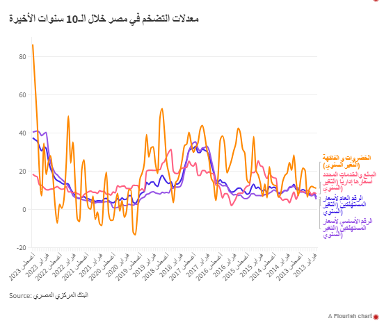 جدير بالذكر، أن التضخم في مصر صعد خلال الأعوام الماضية من 6.2% في عام 2013 إلى أكثر من 37% في 2023، ويظهر في الرسم البياني التالي معدلات التضخم في مصر خلال الـ10 سنوات الأخيرة: