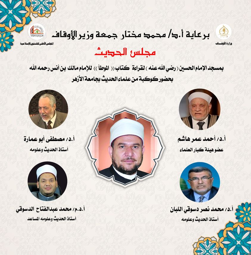 تواصل وزارة الأوقاف والمجلس الأعلى للشئون الإسلامية عقد مجالسها العلمية، حيث يعقد مجلس الحديث الخامس والعشرين لاستكمال قراءة وشرح أحاديث كتاب: الموطأ للإمام مالك بن أنس رحمه الله، بمسجد الإمام الحسين رضي الله عنه.