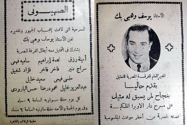 وكان للفنان الكبير يوسف وهبي نصا مسرحيا أيضا عن القضية الفلسطينية، وقد كتبها بالتحديد بعد إعلان الكيان الصهيوني بأن فلسطين أصبحت دولته، فكتب وهبة مسرحية الصهيوني التي قام ببطولتها أيضا وإخراجها على مسرح الأوبرا الملكية، وشاركه البطولة فؤاد شفيق، وأمينة رزق وتدور أحداثها حول شاب ابن باشا عسكري قديم، يسخط على أبوه الذي يراه شابا عابثا فيقرر أن يصبح ضابطا بسلاح الطيران بالجيش المصري تلبية لنداء الواجب في حرب الصهيونيين بفلسطين، وتدور باقي الأحداث حول قضايا جاسوسية.