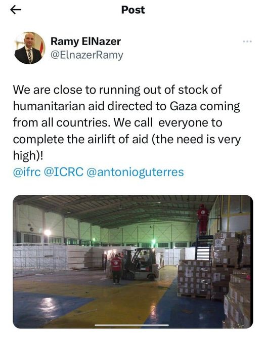 وقال المدير التنفيذي لجمعية الهلال الأحمر المصري، عبر صفحته الرسمية على موقع التواصل الاجتماعي إكس -تويتر سابقًا-: إننا على وشك نفاد مخزون المساعدات الإنسانية الموجهة إلى غزة القادمة من جميع البلدان، الحاجة كبيرة جدًا، داعيًا كافة البلاد إلى استكمال الجسر الجوي للمساعدات الانسانية لدعم الشعب الفلسطيني.