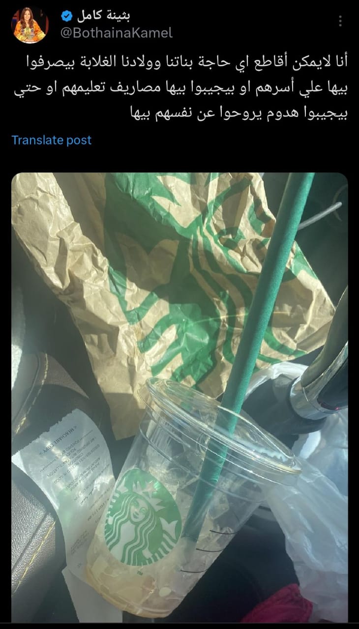 تضمنت الصورة المنشورة، كوب قهوة لـ ستاربكس، الماركة العالمية الشهيرة، وكتبت بثينة عليها: أنا لا يمكن أقاطع أي حاجة بناتنا وولادنا الغلابة بيصرفوا بيها على أسرهم أو بيجيبوا بيها مصاريف تعليمهم أو حتى بيجيبوا هدوم يروحوا عن أنفسهم بيها.