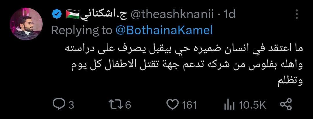 وأضاف متابع آخر قائلا: ما أعتقد أنه يوجد إنسان ضميره حي يقبل أن يصرف على دراسته وأهله بفلوس من شركة تدعم جهة ظالمة تقتل الأطفال كل يوم.