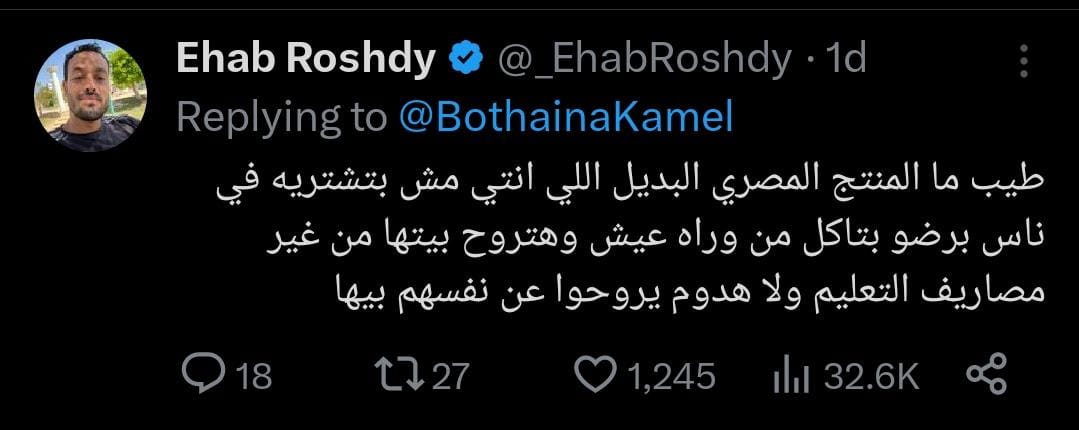 كانت تعليقات المتابعين تعبر عن صدمتهم وخيبة أملهم من موقف الإعلامية الشهيرة، فعلق أحدهم قائلا: المنتج المصري البديل اللي بتشتريه في ناس برضو بتاكل من وراه عيش وهتروح بيتها من غير مصاريف التعليم ولا هدوم يروحوا عن أنفسهم بيها، بينما علقت أخرى قائلة: بس عادي ندفع عشان ولاد وبنات غيرنا ينقتلوا؟