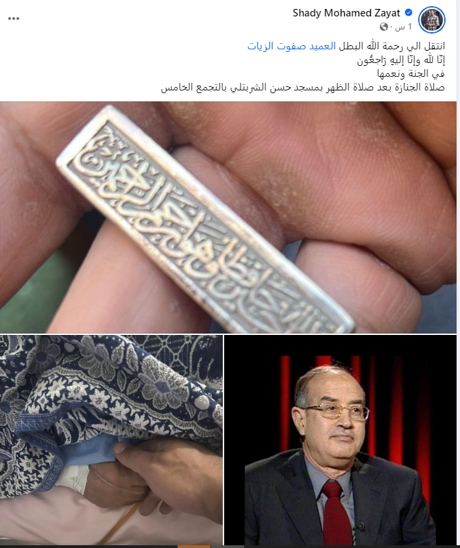 أعلن شادي محمد الزيات، منذ قليل وفاة والده العميد صفوت الزيات.