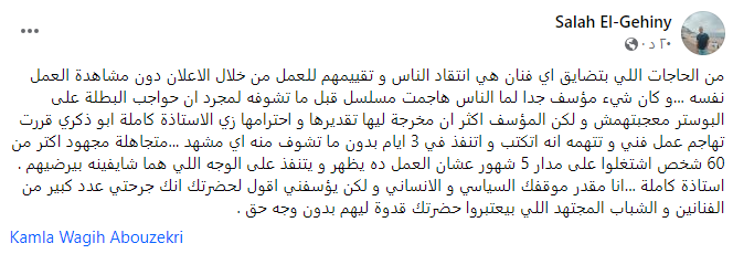 وتابع صلاح الجهيني: كان شيء مؤسف جدًا لما الناس هاجمت مسلسل، قبل ما تشوفه لمجرد أن حواجب البطلة على البوستر معجبتهمش، ولكن المؤسف أكثر أن مخرجة ليها تقديرها واحترامها زي الأستاذة كاملة أبو ذكري، قررت تهاجم عمل فني وتتهمه أنه اتكتب واتنفذ في 3 أيام بدون ما تشوف منه أي مشهد، متجاهلة مجهود أكتر من 60 شخص اشتغلوا على مدار 5 شهور عشان العمل ده يظهر ويتنفذ على الوجه اللي هما شايفينه بيرضيهم.