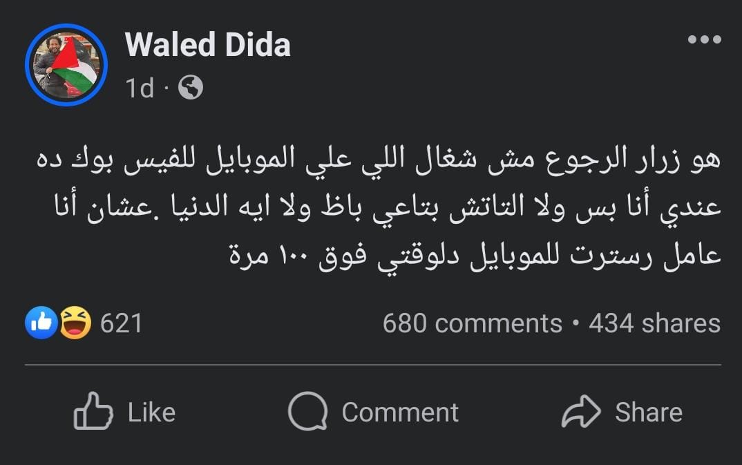 اشتكى العديد من مستخدمي موقع التواصل الاجتماعي فيس بوك، لليوم الثالث على التوالي، من عدم استجابة زر الرجوع عند الضغط عليه في حال الدخول إلى المنشورات والرغبة في العودة إلى الصفحة الرئيسية، حيث إنه أصبح الحل الوحيد هو الضغط على سهم الرجوع في جهة اليسار أعلى شاشة الهاتف.