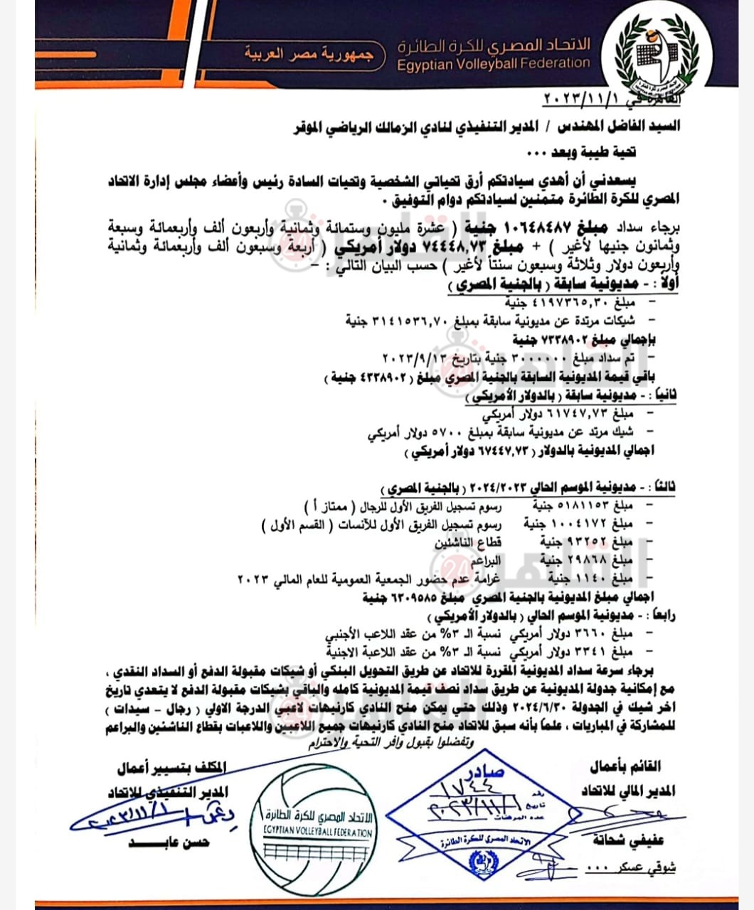 اتحاد الطائرة يخاطب الزمالك بسداد 10 ملايين جنيه و74 ألف دولار | مستند