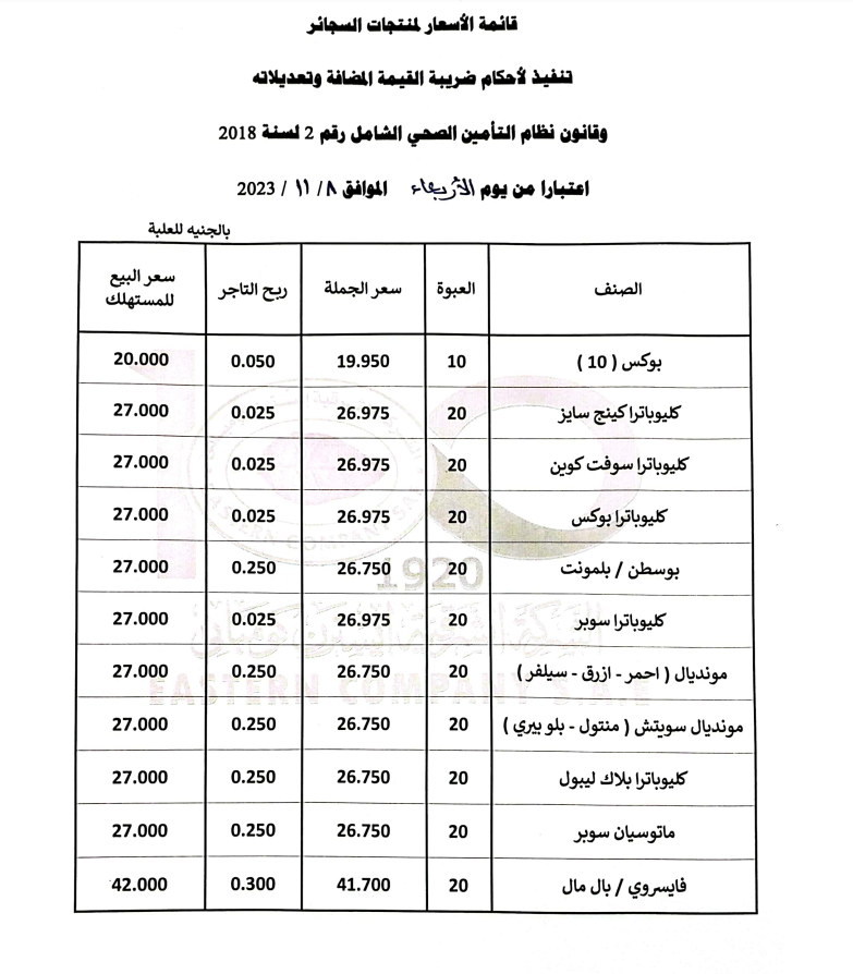 قررمجلس إدارة الشركة الشرقية للدخان رفع أسعار السجائر وذلك تنفيذا لأحكام ضريبة القيمة المضافة وتعديلاته وقانون نظام التأمين الصحي الشامل رقم 2 لسنة 2018، وذلك اعتبارا من اليوم 8 نوفمبر 2023. وجاءت الأسعار كالتالي: