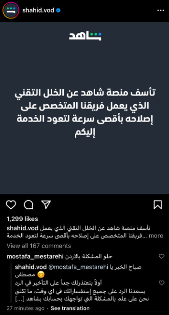 وكتبت منصة شاهد، منشورًا عبر حسابها الشخصي بموقع تبادل الصور والفيديوهات انستجرام، قائلة: تأسف منصة شاهد عن الخلل التقني الذي يعمل فريقنا المتخصص على إصلاحه بأقصى سرعة لتعود الخدمة إليك.