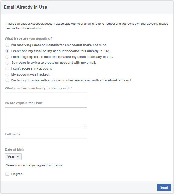 - في خانة الشرح سيتم كتابة هذا الشرح على سبيل المثال: "مرحبا إدارة فيس بوك، لا يمكنني إضافة بردي الإلكتروني على حساب فيس بوك لأنه مستخدم من قبل شخص آخر، ولا يمكنني الدخول على حسابي، برجاء حل المشكلة".