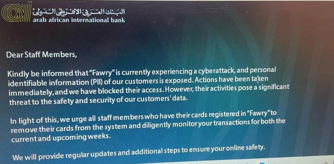 تحدث البنك العربي الإفريقي الدولي عن واقعة تعرض الحسابات الشخصية الخاصة بشركة فوري لـ هجمات سيبرانية، واختراقات أمنية، بعد توقف الموقع الإلكتروني والأبلكيشن الخاص بفوري، وتأكيد عملية الاختراق للحسابات الخاصة بالعملاء.