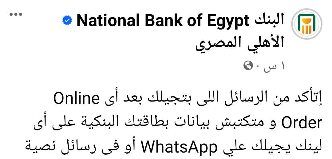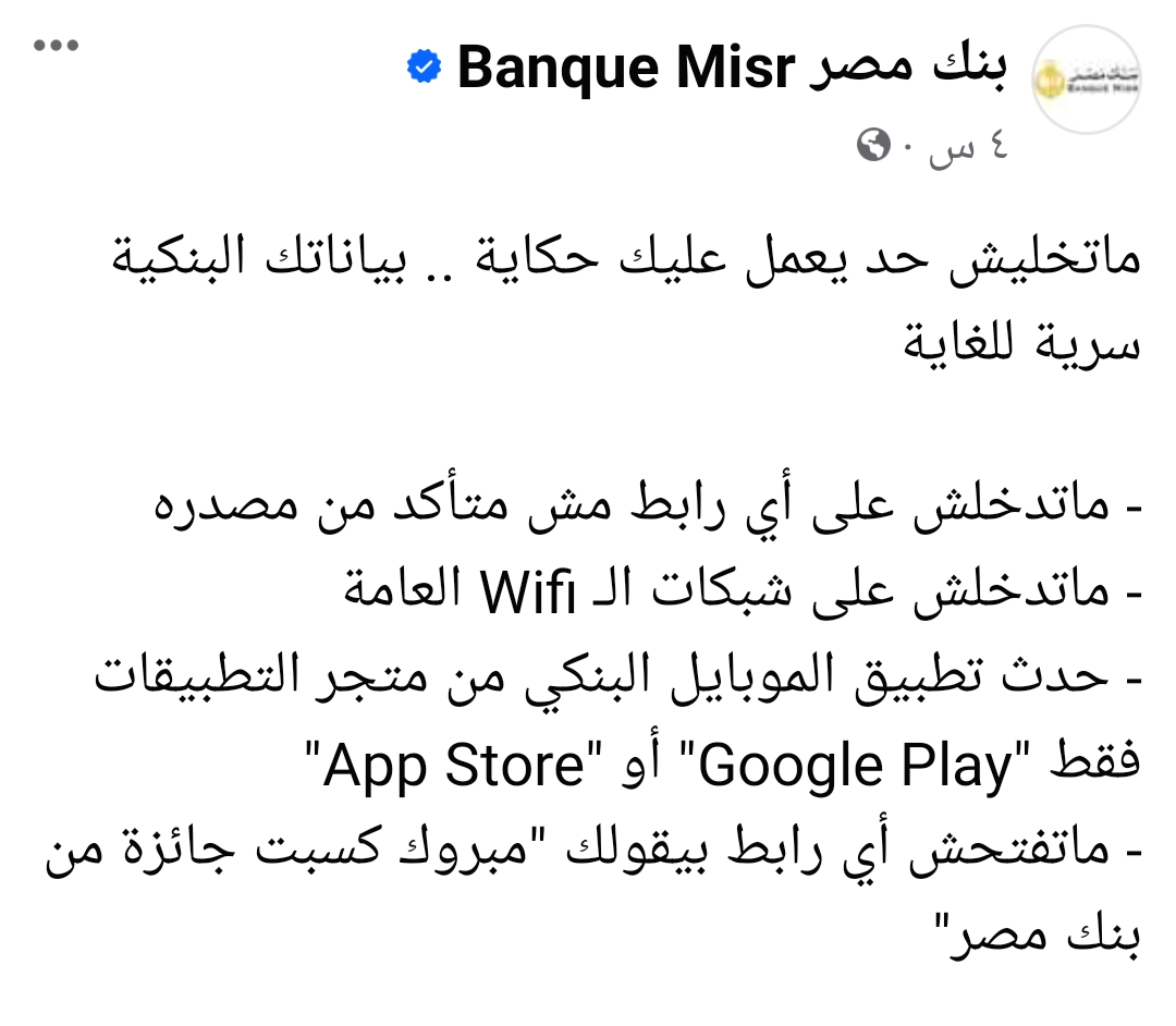 كما طالبت البنوك أيضا عبر صفحاتها الرسمية بموقع التواصل الاجتماعي فيس بوك، العملاء بضرورة الحفاظ على بياناتهم الشخصية وعدم الدخول على أي روابط غير معلوم مصدرها فضلا عن عدم الاتصال بشبكات الـ Wifi العامة.